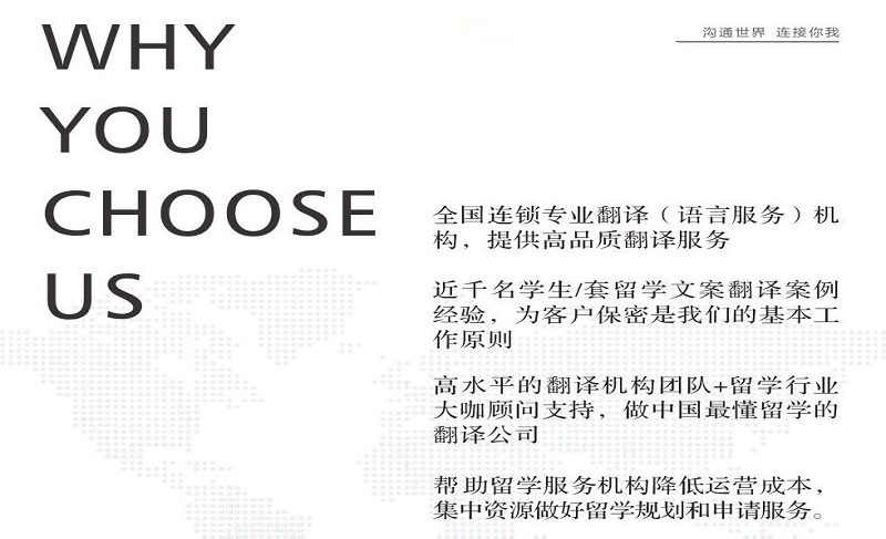 為確保文書質量,公司專門抽調12名專職筆譯人員(大多具有留學行業(yè)背景并取得國家人事部翻譯資格證書)進行不間斷的專業(yè)培訓學習,以期更深入的了解國外院校申請的要求、流程以及個人陳述等關鍵文書撰寫和翻譯需要注意的要點。我們在拓展和細化語言服務領域的同時希望能夠利用我們強大的語言人才儲備力量幫助更多的國際教育機構、海外院校、移民中介機構等等提高共作效率降低運營成本,最終實現(xiàn)互利共贏的目標。